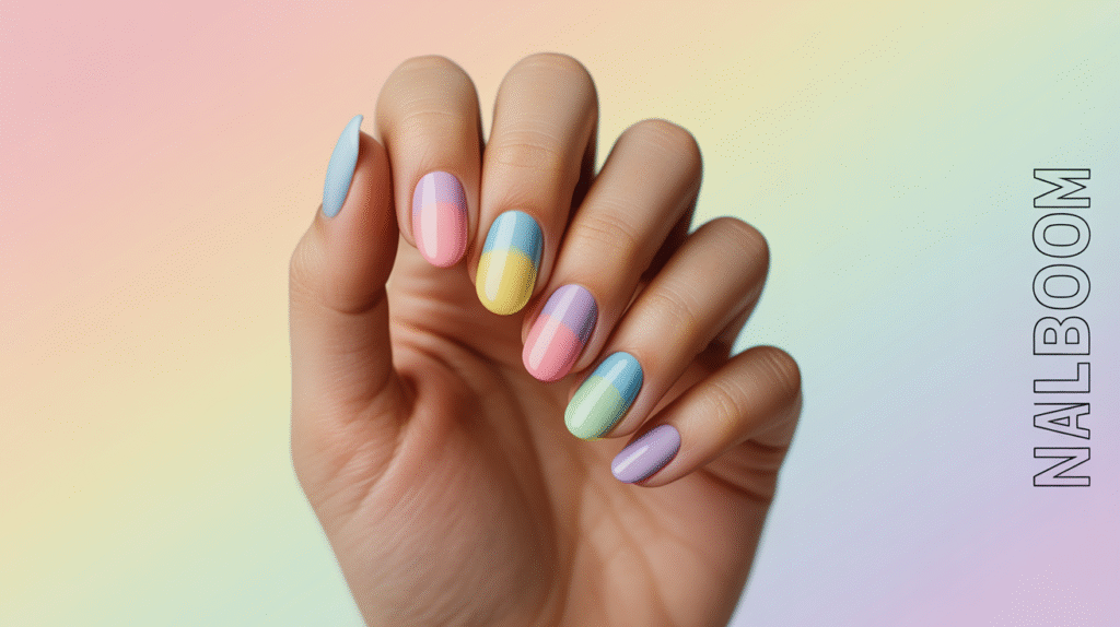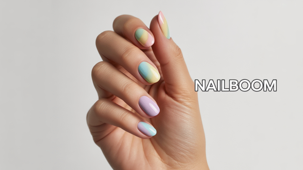 This look works beautifully on medium to long nails, especially almond, oval, or coffin shapes where the pastel transitions can stretch smoothly. The soft tones make the design feel cute and charming rather than bold or overwhelming. For extra dimension, a glossy gel top coat adds shine, while an iridescent shimmer can enhance the ethereal vibe.
