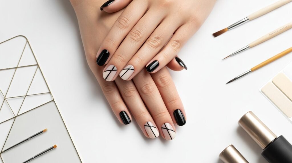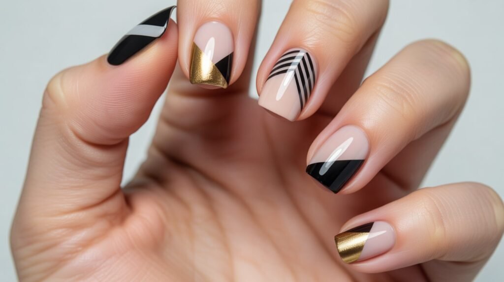 Try pairing neutral bases like beige or white with pops of black, gold, or neon for a high-contrast effect. You can use tape or nail art brushes to create crisp shapes and angles—perfect for DIY enthusiasts who love precision. For a softer approach, experiment with pastel or metallic shades to give your geometric design a more playful vibe.