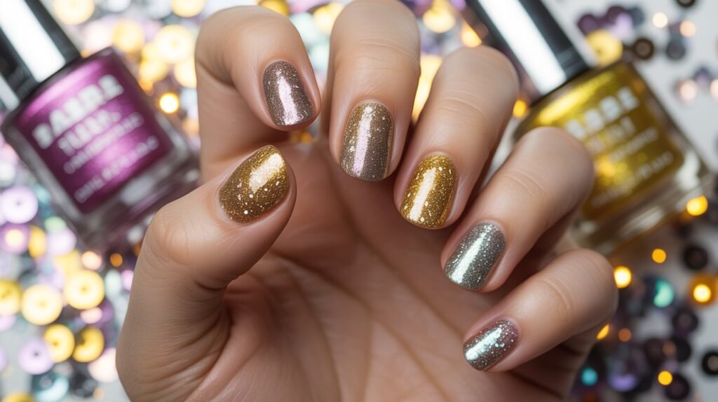 For an easy DIY, apply a clear polish and dip your tips into fine glitter, or use glitter top coats for a mess-free sparkle. Don’t forget a glossy seal to lock in the shine and make your manicure last longer—perfect for those Pinterest-worthy, dazzling nail selfies!