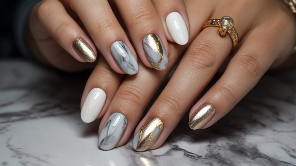 The marble effect can be achieved in several ways—using water marbling, nail foils, or simple swirl techniques with a thin brush. You can choose to marble all your nails or highlight just one or two as statement pieces. Adding metallic accents, like thin gold or silver lines, can take the look to another level of glam.