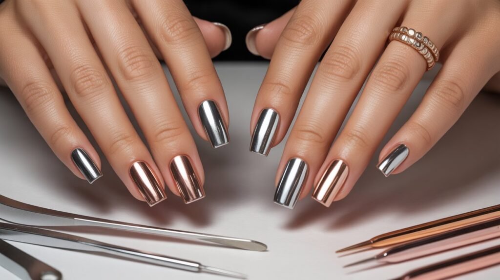 You can go full chrome for a powerful, modern effect or combine metallic accents with matte or nude bases for contrast. Try geometric tips, foil overlays, or accent nails in a different shade to create dimension and depth. Chrome powder and metallic polish make it easy to achieve that flawless, reflective finish right at home.