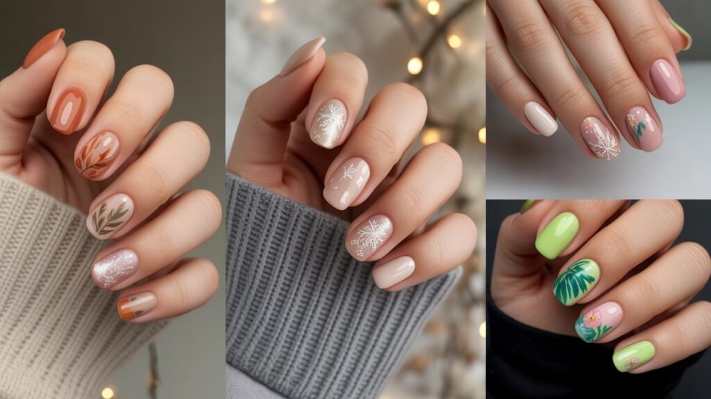 In the fall, try warm shades like burnt orange, burgundy, and gold with leaf or plaid designs. Winter calls for shimmering silvers, icy blues, or red-and-green holiday themes. When spring arrives, soft pastels and floral details take center stage, while summer nails shine with tropical patterns, ocean waves, and fruity accents.