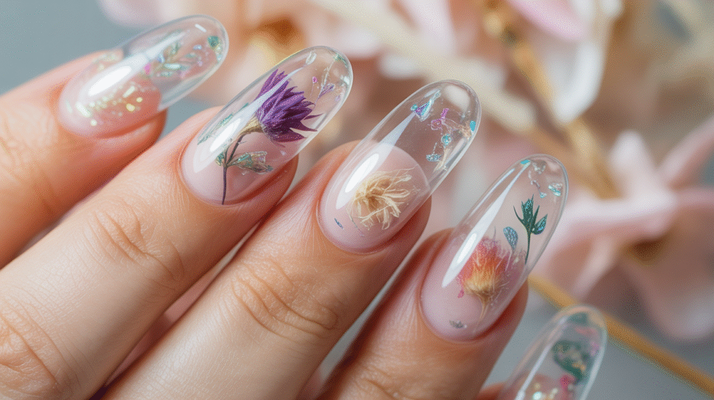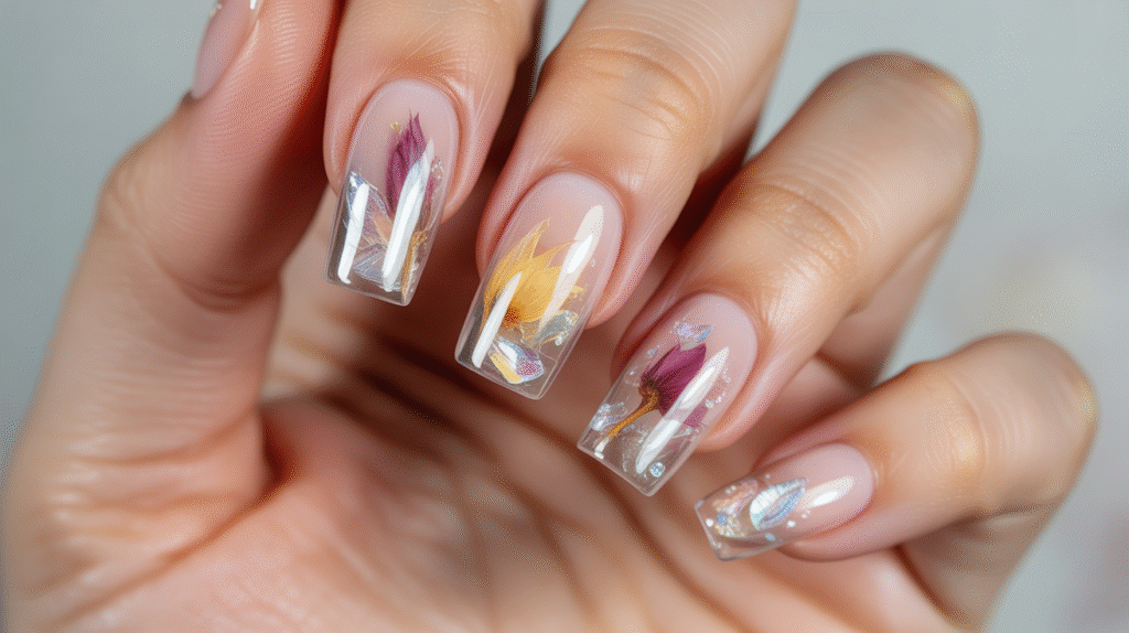 10: Clear Acrylic Nails with Encapsulated Designs (Beginner-Friendly Creative Style)