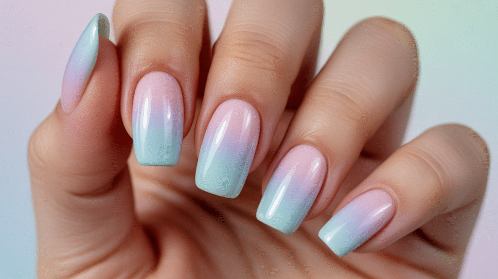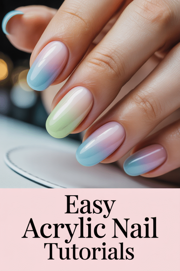 Finish by capping everything with a clear acrylic layer and a glossy top coat. The result is a soft, blended pastel gradient that looks salon-level but is easy for beginners to master. This style photographs beautifully and always performs well on Pinterest because of its soft, dreamy aesthetic.
