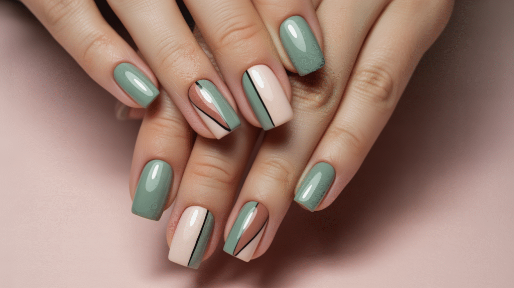 Seal the design with a glossy top coat, making sure the lines look smooth and crisp. Color-block nails always photograph beautifully because of their bold edges and trendy combinations. They’re perfect for beginner nail artists who want to experiment with color while keeping the technique simple and easy to control.