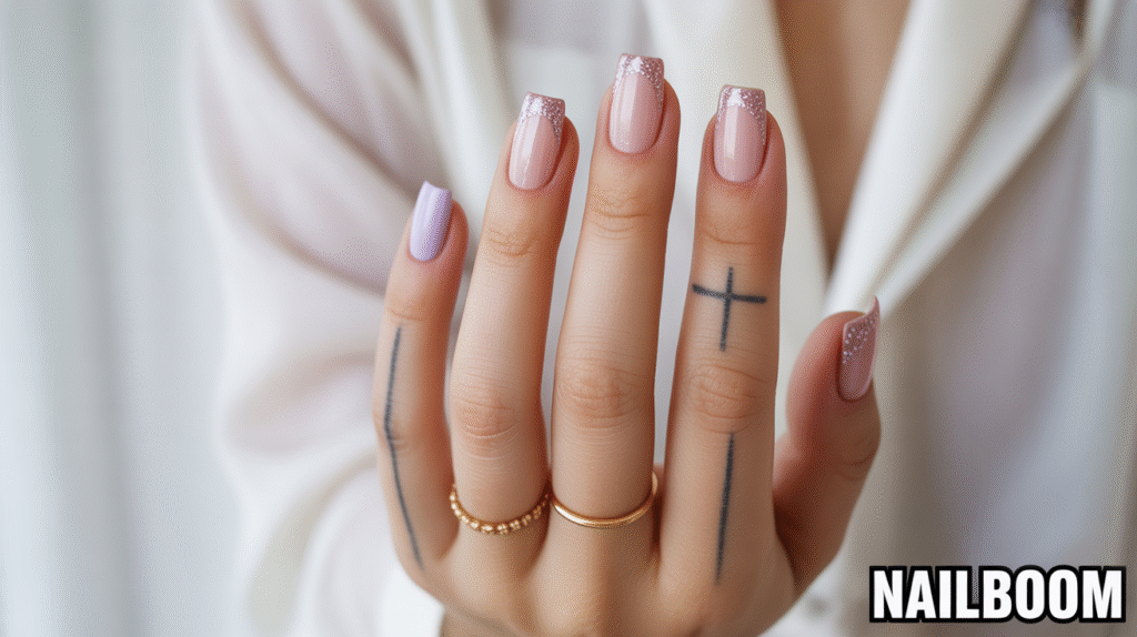 Pairing this design with delicate rings and minimalistic finger tattoos adds elegance and personality. The contrast between the soft base, sharp lines, and sparkling glitter makes the nails visually striking, perfect for Pinterest photography. Even beginners can achieve a chic, professional-looking manicure with this simple yet trendy approach.