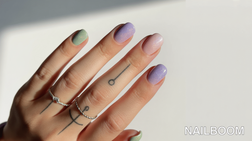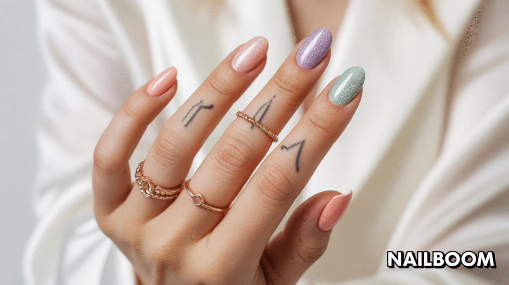 Accessorize this look with minimalistic rings and subtle finger tattoos to draw attention to the gradient effect. The combination of glitter, gradient colors, and hand accessories makes this style perfect for Pinterest photography. It’s a versatile design that allows beginners to experiment with color, texture, and shine while keeping their manicure elegant and visually appealing.