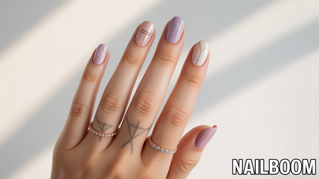 To create this design, start with a base coat and a neutral or pastel nail polish. Once dry, use a thin nail art brush or striping tape to draw minimalist lines across the nails. Apply glitter polish along these lines or on select sections of the nails for a sparkling accent. Finish with a clear topcoat to seal the design, enhance the glitter, and ensure a smooth, long-lasting finish.