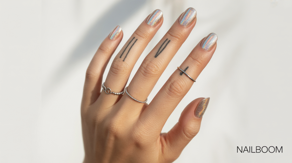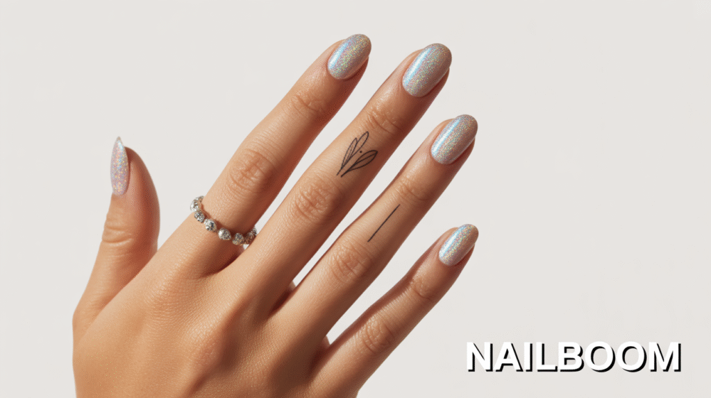 Accessorizing with delicate rings or subtle finger tattoos adds a stylish, personalized touch. The holographic shimmer combined with minimalistic hand accessories makes the nails visually dynamic, perfect for Pinterest or social media posts. Even beginners can achieve a mesmerizing, professional-looking manicure with this easy technique, making it a must-try for glitter lovers.