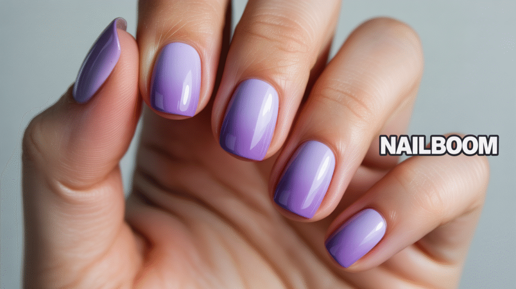 Start with a light lavender or soft lilac base coat to give your nails a smooth foundation. On your makeup sponge, apply two purple shades—lighter at the cuticle area and darker toward the tip. Gently tap the sponge onto the nail, moving slightly up and down to blend the colors softly. Lavender tones blend easily, which makes this design ideal for those still learning how to control gradient transitions.