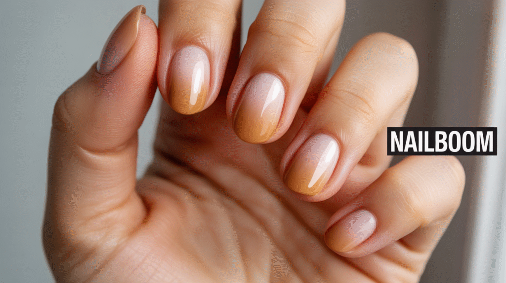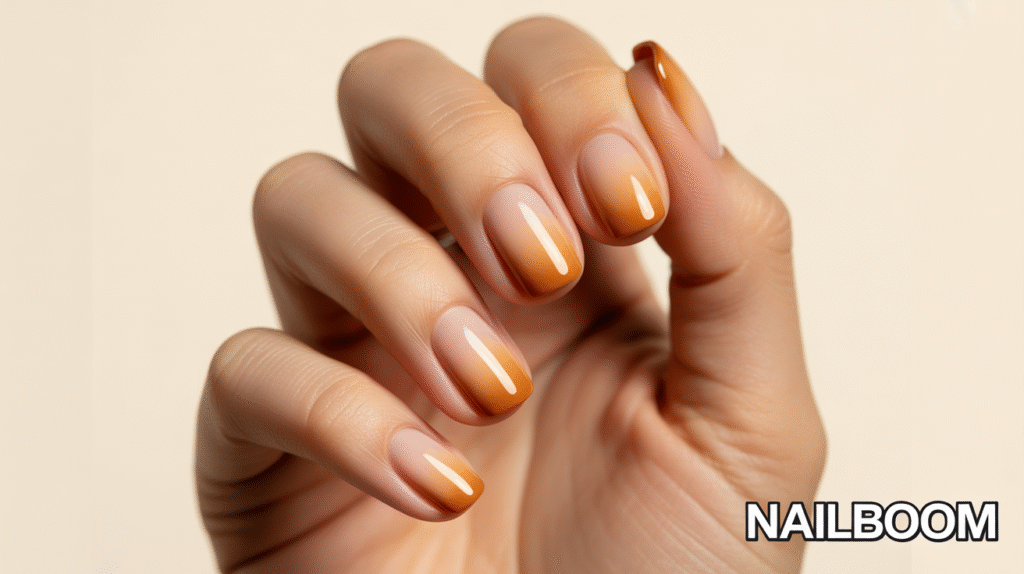 If you prefer something warm, neutral, and wearable for every day, the nude caramel ombre is the perfect choice. This gradient blends soft beige tones with warm caramel shades, creating a subtle yet classy fade suitable for work, special events, or casual outfits. It’s a great starting point for beginners because the colors are close in tone, making blending much easier.