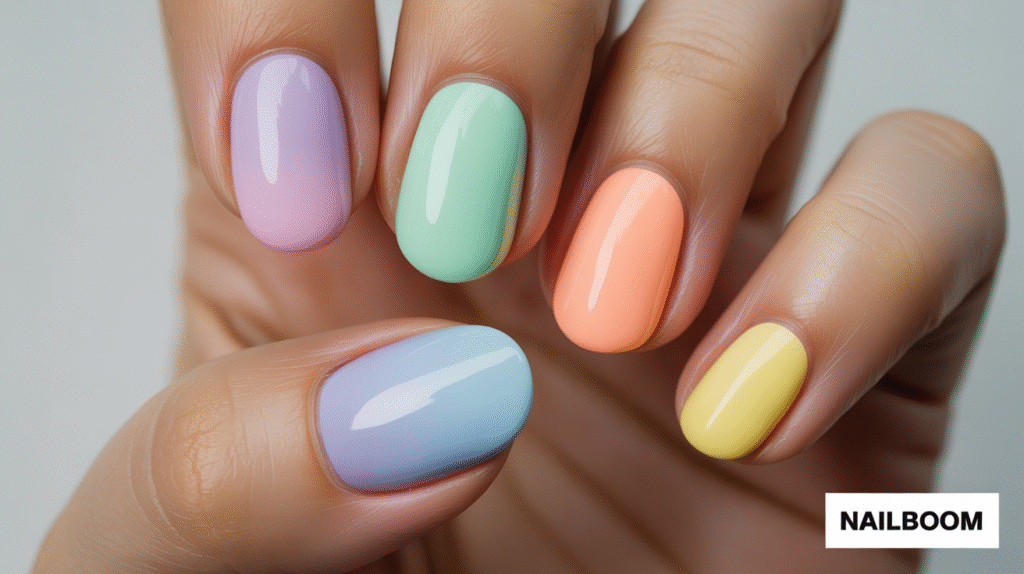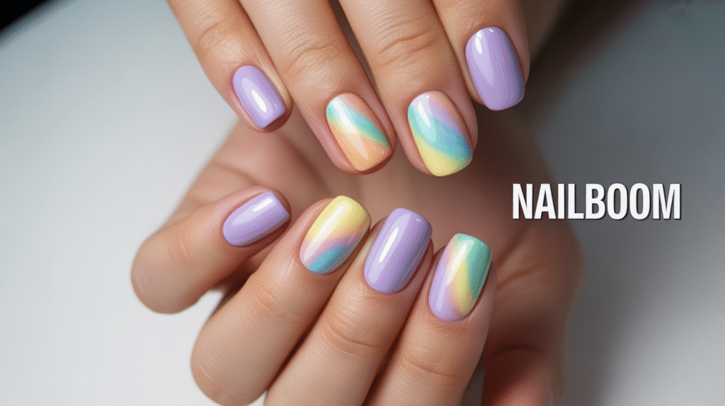 Start by painting your nails with a light base coat, preferably white or pale nude, to help the pastel colors pop. Use a makeup sponge and apply two or three pastel shades in horizontal stripes. Gently dab the sponge onto each nail, letting the colors blend naturally. You can alternate color combos per nail for a cascading rainbow effect across your hand. Don’t worry if the first layer looks faint—pastels often require two or three passes for full opacity.