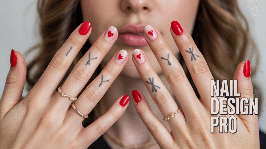 Hearts can be placed in different styles: one large heart in the center, multiple small hearts scattered across the nail, or a diagonal line of tiny hearts along the nail tip. This versatility allows beginners to personalize their look without complicating the design. The red base enhances the romantic feel, while the accent hearts make the nails stand out for special occasions like Valentine’s Day or date nights.