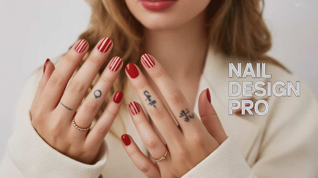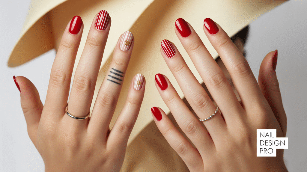 This design is highly versatile and allows beginners to experiment with different patterns and nail layouts. You can mix thick and thin stripes, alternate colors, or even create stripes on just a single accent nail for a minimalistic touch. The combination of red with subtle stripes draws attention to your nails while keeping the overall look elegant and polished. Striped nails are perfect for casual outings, office wear, or special occasions, making them a go-to design for any beginner looking to elevate their manicure.