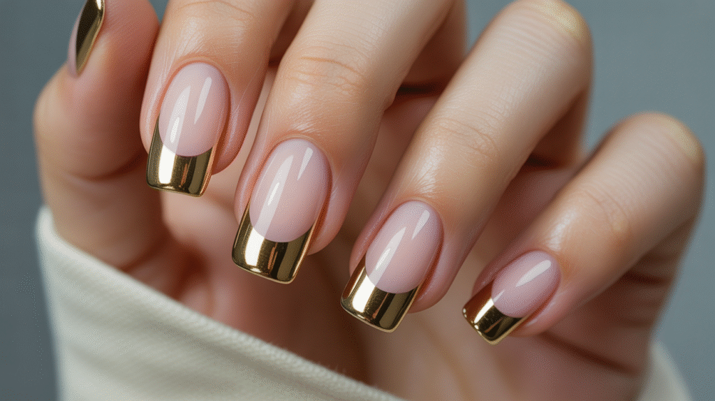 You can choose from silver chrome for a cool, edgy look, rose gold chrome for a softer feminine shine, or gold chrome for a rich and luxurious feel. Pair it with a neutral base such as milky white, nude, or soft pink to balance the reflective finish and keep the overall look elegant. Some variations even include chromed reverse French tips or chrome outlines for extra dimension.