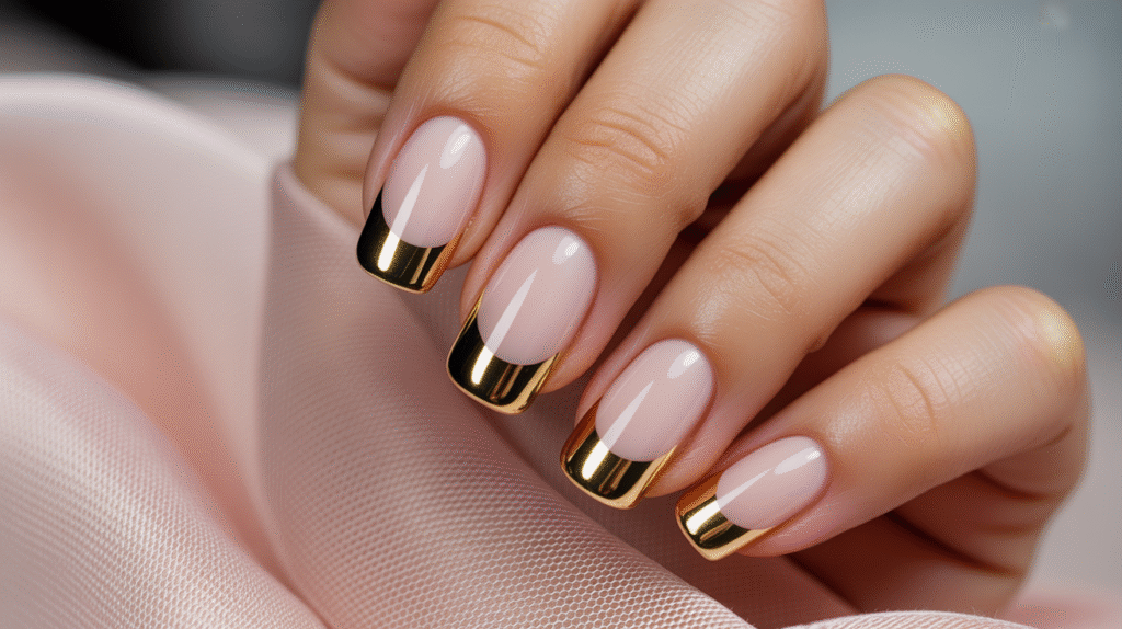 If you’re craving a French manicure that feels glamorous and high-end, metallic gold French tips are the ultimate statement. Instead of traditional white, the tips are painted in a reflective gold that adds instant luxury and sophistication. This design shines beautifully in any lighting, making it perfect for parties, holidays, weddings, and upscale events.