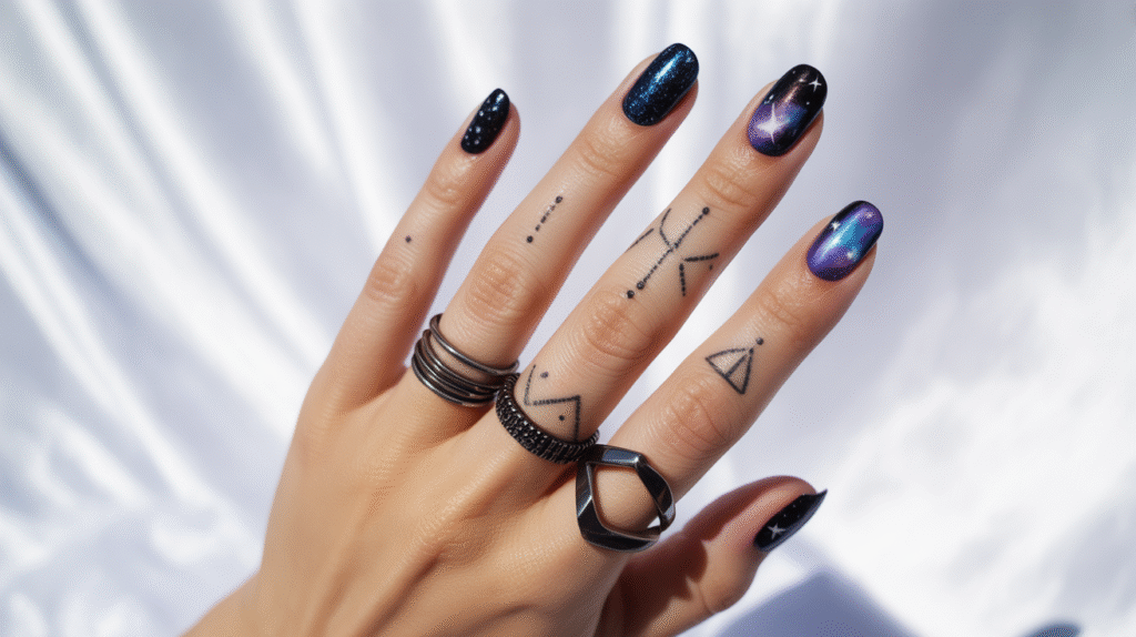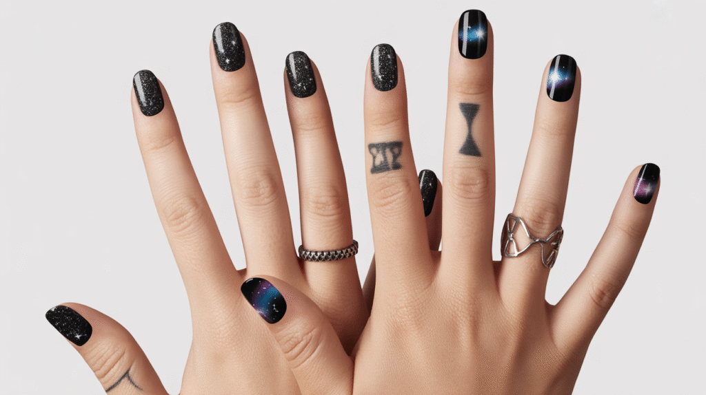 To enhance the celestial aesthetic, you can add tiny star decals, crescent-moon accents, or a glitter gradient that fades like stardust across the nail. Pairing matte black with glossy glitter accents is another trendy twist that gives the design extra edge. These nails are perfect for anyone who loves bold, editorial-style manicures that feel both modern and magical—like carrying a piece of the night sky on your fingertips.