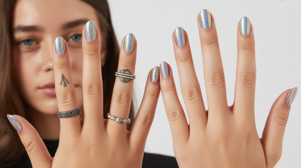 To elevate the design, consider mixing holographic glitter with chrome powder, adding accent nails, or creating a diagonal or vertical glitter gradient. You can even opt for a full holographic manicure if you want maximum brilliance. These nails are perfect for those who love trendy, eye-catching styles and enjoy playing with light and color. Holographic glitter shine brings fun, flair, and a futuristic touch to any occasion.