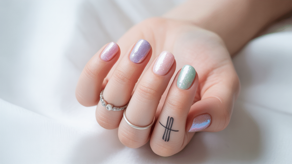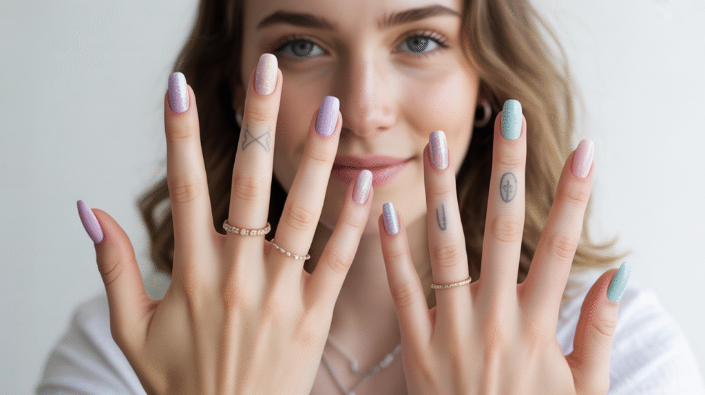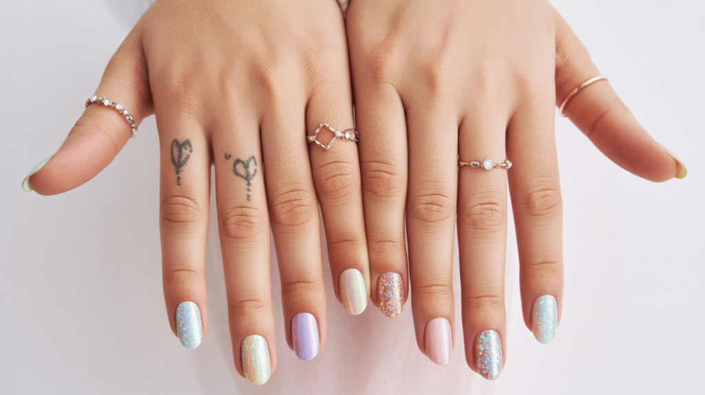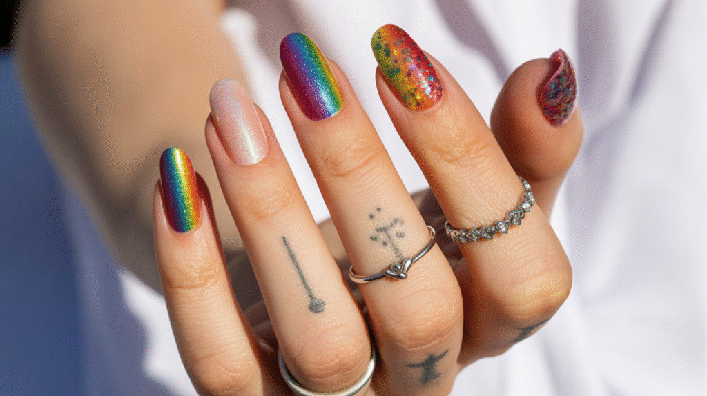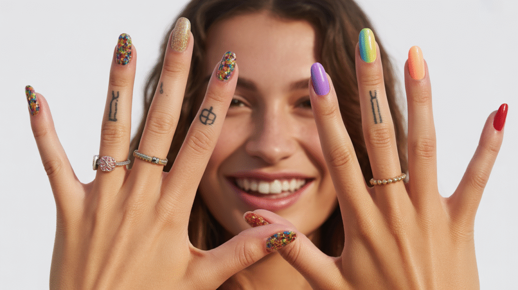 The charm of this design lies in its versatility and creativity. You can assign a different color to each nail, create a gradient rainbow across your hand, or even mix multiple glitter colors on a single nail for a dazzling effect. Fine holographic glitter, chunky confetti-style sparkles, and subtle shimmer gradients can all be incorporated to enhance the dimension and brilliance of the design. This style works well on all nail shapes but looks especially striking on almond or coffin nails.