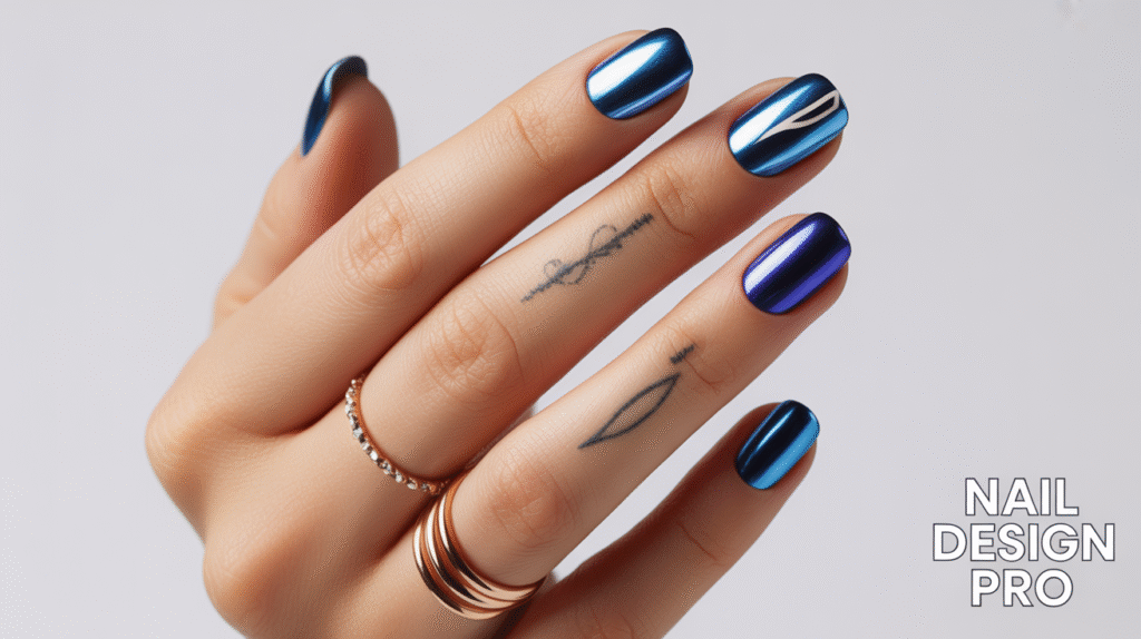 If you prefer a softer approach, apply chrome blue on one or two accent nails and keep the rest in matte or glossy solid blue. This contrast allows the metallic shine to pop while keeping the manicure stylish, wearable, and visually balanced.