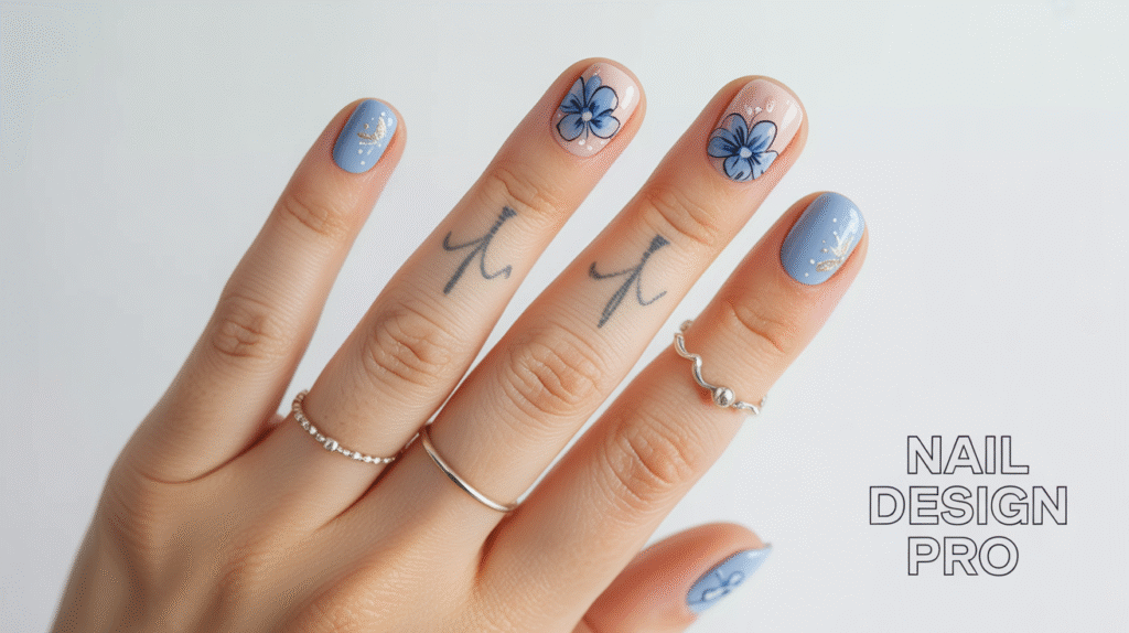 For a subtle style, apply floral designs on one or two accent nails while keeping the rest in solid pastel or baby blue. This creates a gentle, elegant manicure that’s perfect for everyday wear, brunch dates, or special occasions without looking too bold.