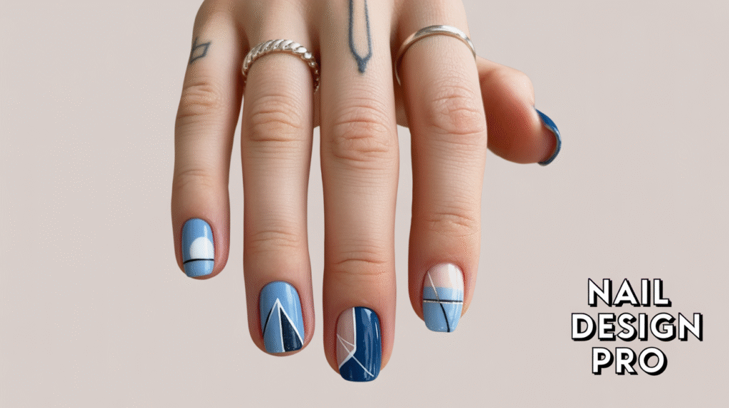 Blue geometric nail designs are perfect for those who love clean lines, modern patterns, and artistic details. This trend uses different shades of blue combined with precise line art, shapes, and abstract patterns to create a bold yet sophisticated look. From thin white or silver lines to structured squares and triangles, geometric designs add a contemporary edge while still feeling chic and wearable. These nails are ideal for anyone who prefers a minimalist yet eye-catching manicure.