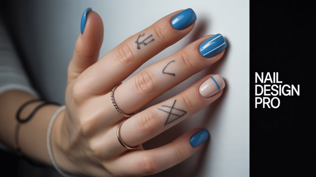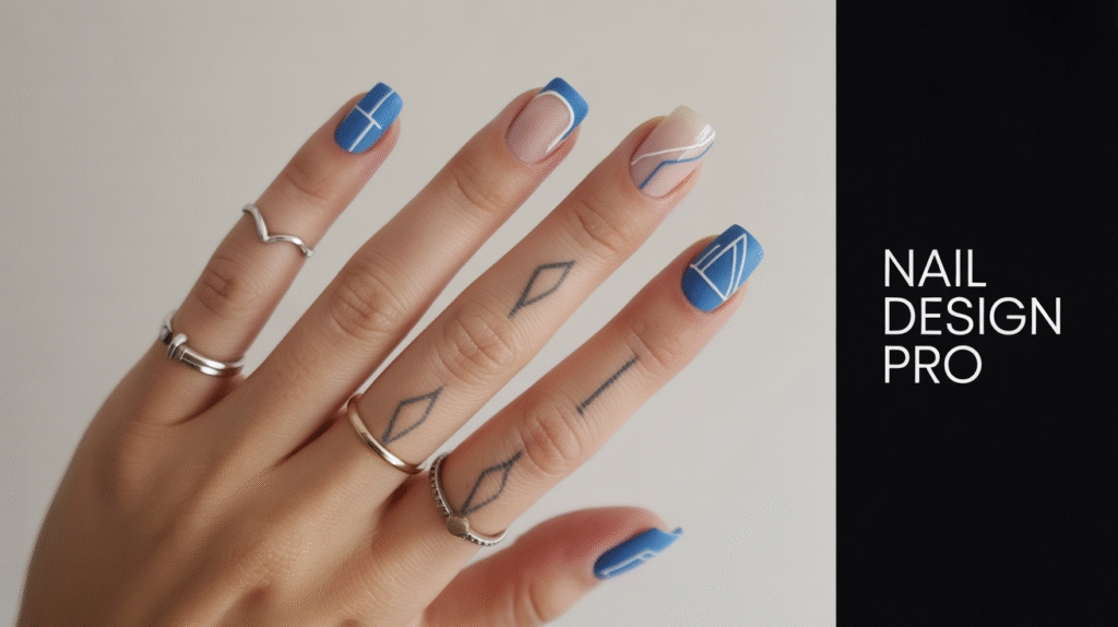 For a refined everyday look, keep most nails solid blue and add geometric line art to one or two accent nails. This minimalist approach keeps the design polished and trendy while allowing the artistic details to shine without overwhelming the manicure.