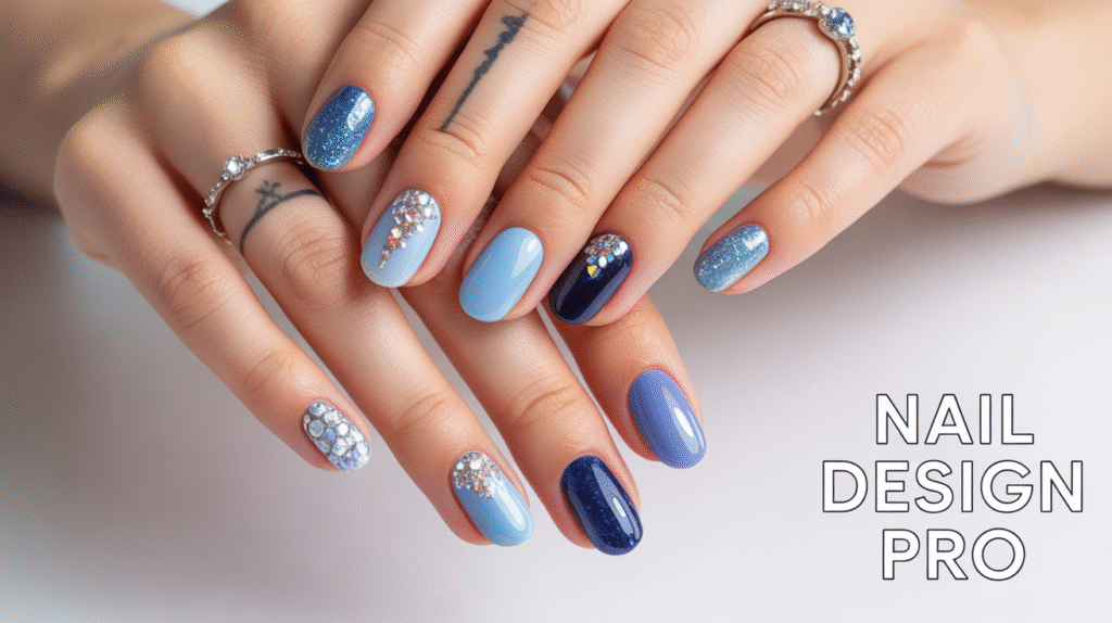 Rhinestones can be placed near the cuticle, along the nail edges, or in delicate clusters to add dimension without overpowering the design. Mixing glitter nails with solid glossy blue shades helps balance the look, keeping it elegant rather than overly dramatic. This glamorous blue nail trend looks stunning under bright lights and photographs beautifully for Pinterest and social media.
