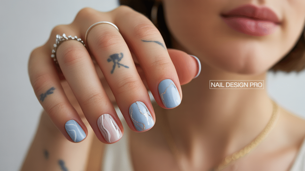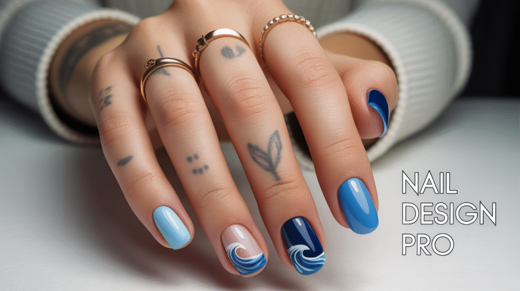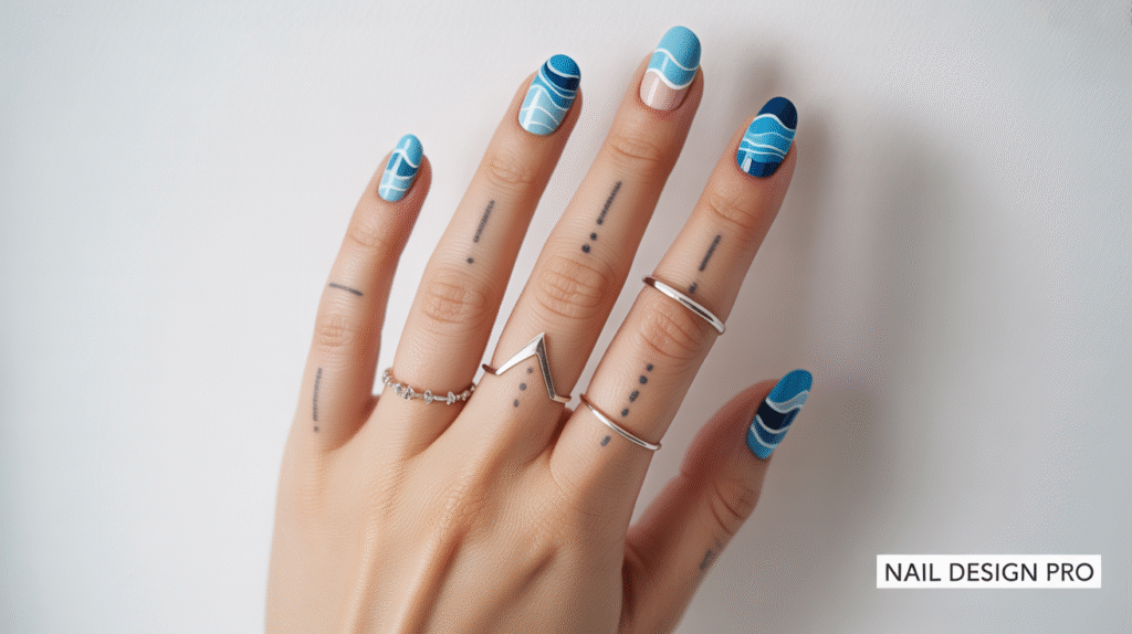 For those who love a subtler approach, minimalist wave accents on one or two nails can make a big impact. A single wavy line in white or silver on a pastel blue nail adds dimension without overwhelming the look. Pair it with a glossy nude or soft blue on other nails to create a balanced, modern aesthetic that’s perfect for daily wear.