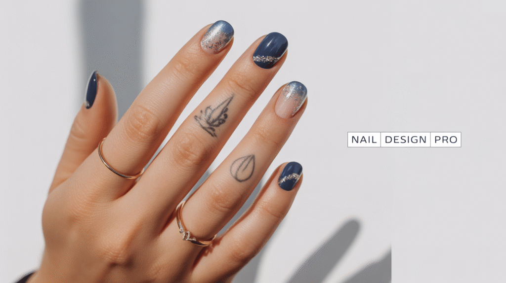 Designs can vary from full glitter coverage on one or two nails to delicate silver stripes or polka dots for a more subtle sparkle. Mixing matte navy with glossy silver details also adds texture and depth, creating a professional, salon-quality finish at home. This style is perfect for those who want a versatile look that can transition seamlessly from daytime elegance to nighttime glam.