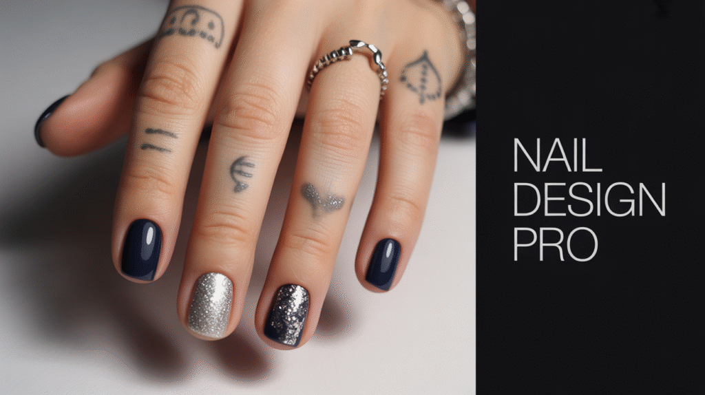 For a more understated look, consider accentuating only the ring or middle finger with silver glitter or foil, keeping the other nails in solid navy. This minimalist approach highlights the sparkle while maintaining a clean, polished appearance, making it suitable for both work and special occasions.