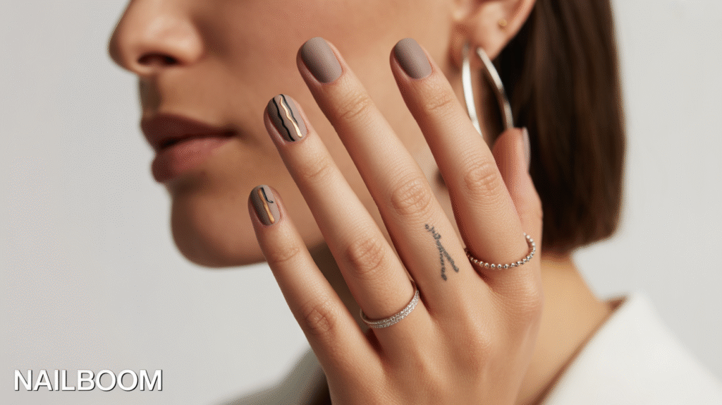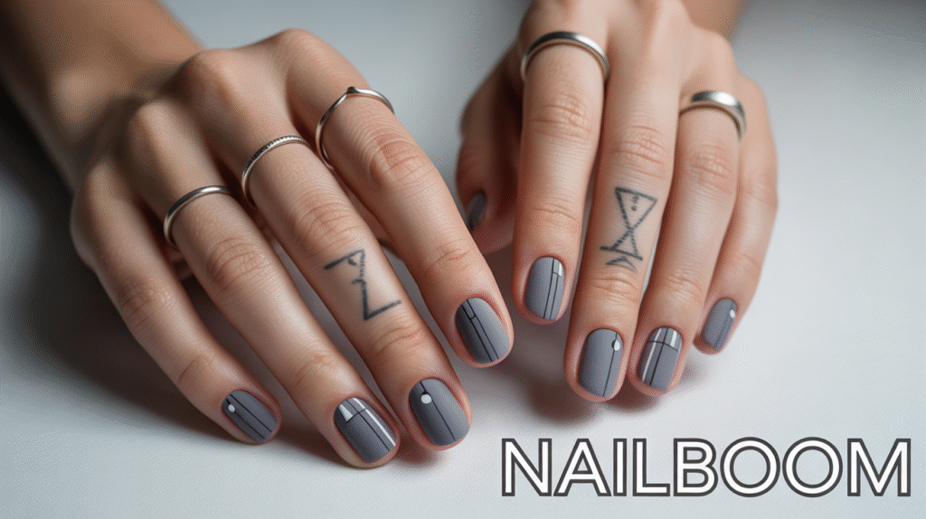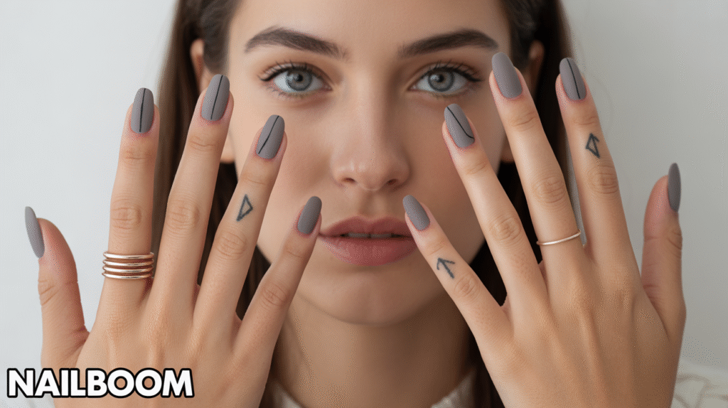 The beauty of this look is its versatility. Matte grey nails with minimalist geometry complement both casual and professional outfits, making them ideal for everyday wear or special occasions. Pairing the manicure with metallic or matte rings further enhances the modern aesthetic while keeping the overall vibe clean and polished.