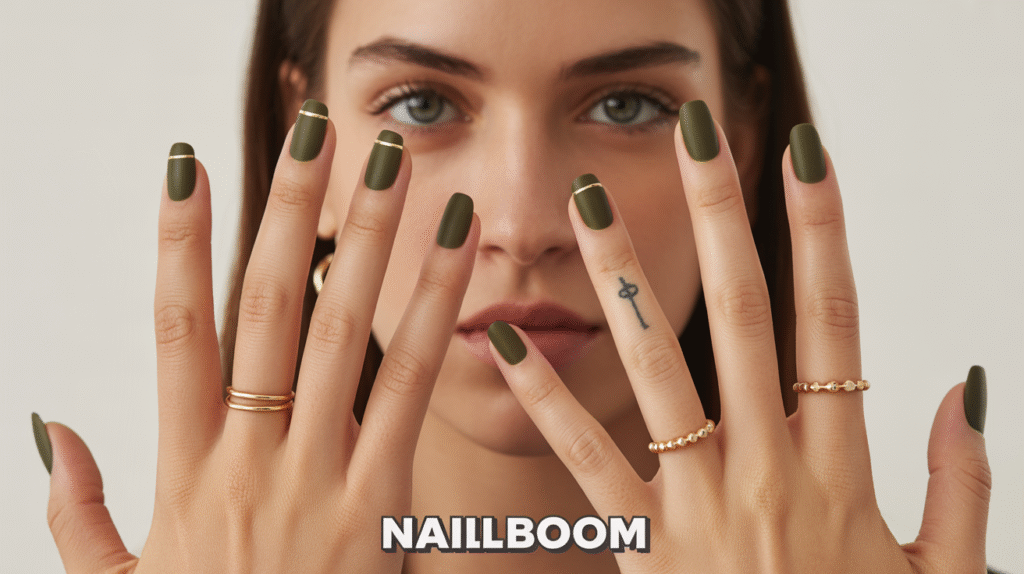 Olive matte nails are especially loved in 2026 for their versatility across seasons. They feel cozy and earthy for fall, yet fresh and wearable for spring. Combined with the luxurious effect of gold accents, this manicure offers a timeless, editorial look that feels unique yet easy to maintain.