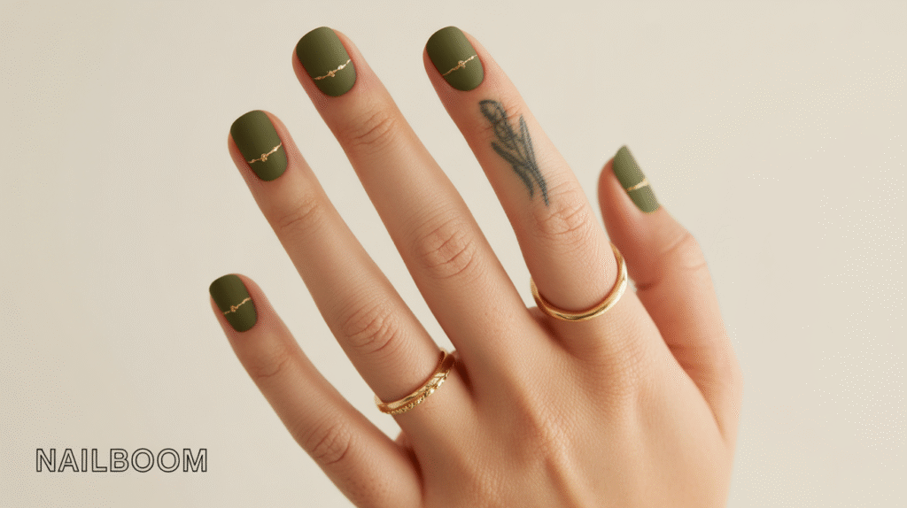 4: Matte Olive Green Nails With Gold Minimalist Detailing
