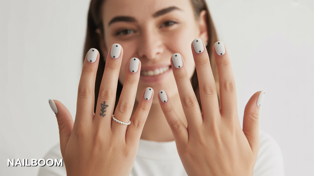 The beauty of this trend lies in its versatility. You can place the dots at the base of the nail, along the center line, or near the tips for a more geometric vibe. Even with its simplicity, this manicure makes a strong visual impact and pairs well with everyday outfits, formal looks, or any event where you want clean, refined nails that stand out softly.