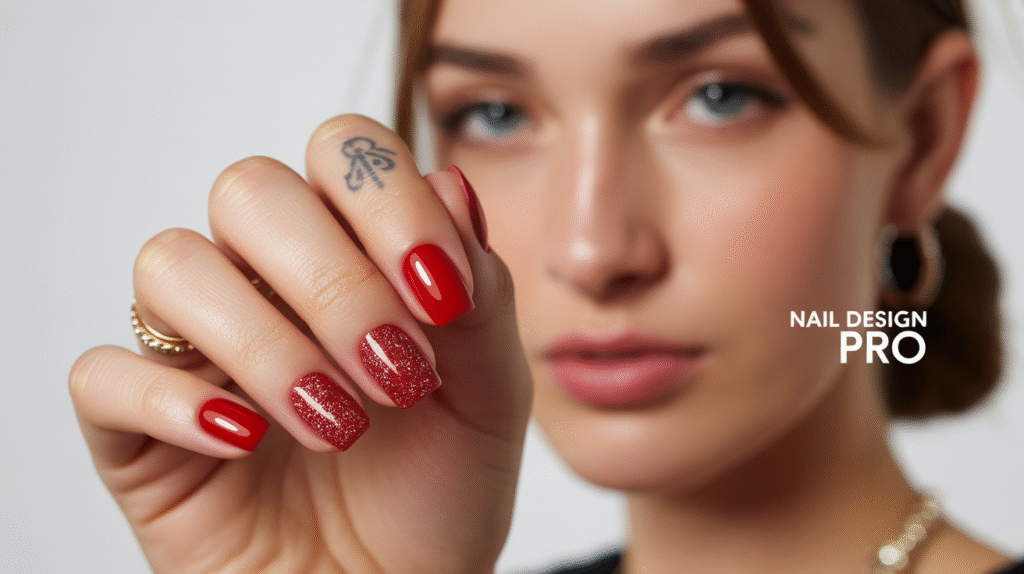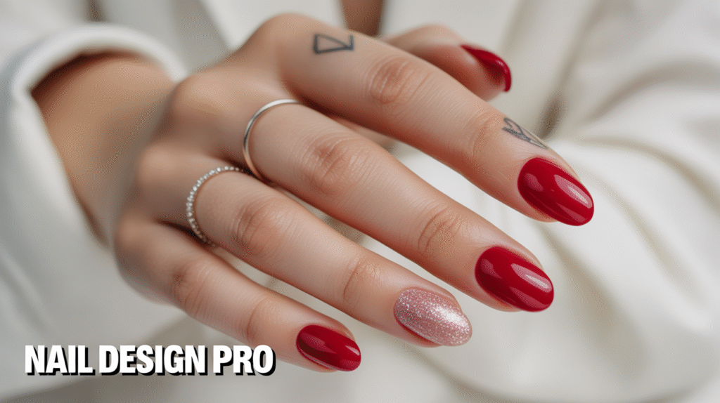 10: Red Accent Nails with Minimal Glitter for Subtle Glam