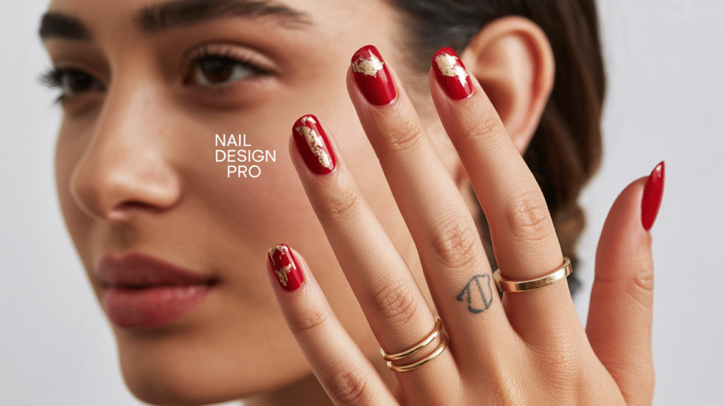 What makes this style irresistible is how flexible it is. You can apply gold foil in small, delicate fragments near the cuticle for a minimal, classy look, or spread it more generously across the nail for a more dramatic, statement-worthy design. Whether you prefer a full red base or a mix of negative space and red polish, the gold accents catch the light beautifully and add a dimension of luxury that feels modern and fashion-forward.