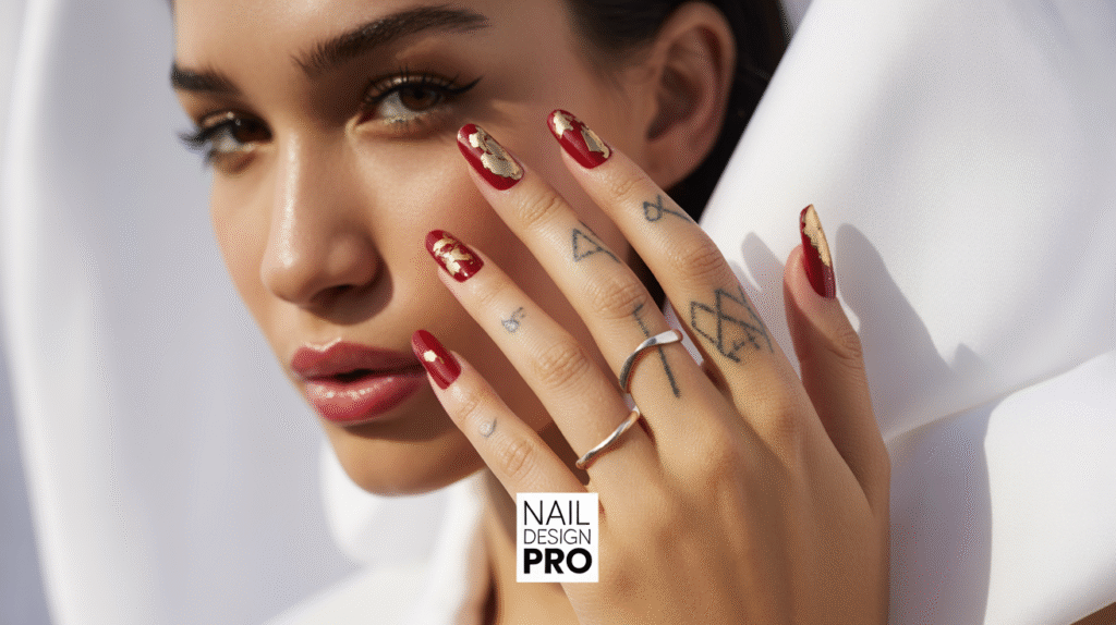 Red nails paired with gold foil accents are one of the most luxurious nail trends of 2026. The combination of bold red and shimmering gold creates a rich, high-end aesthetic that instantly elevates any manicure. Gold foil adds a touch of artistic irregularity, giving each nail a unique, handcrafted feel while still keeping the look cohesive and elegant. This trend is perfect for anyone who loves a glamorous, jewellery-inspired manicure.