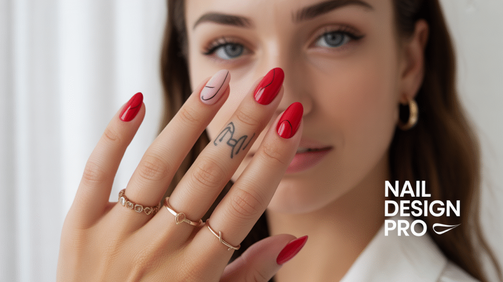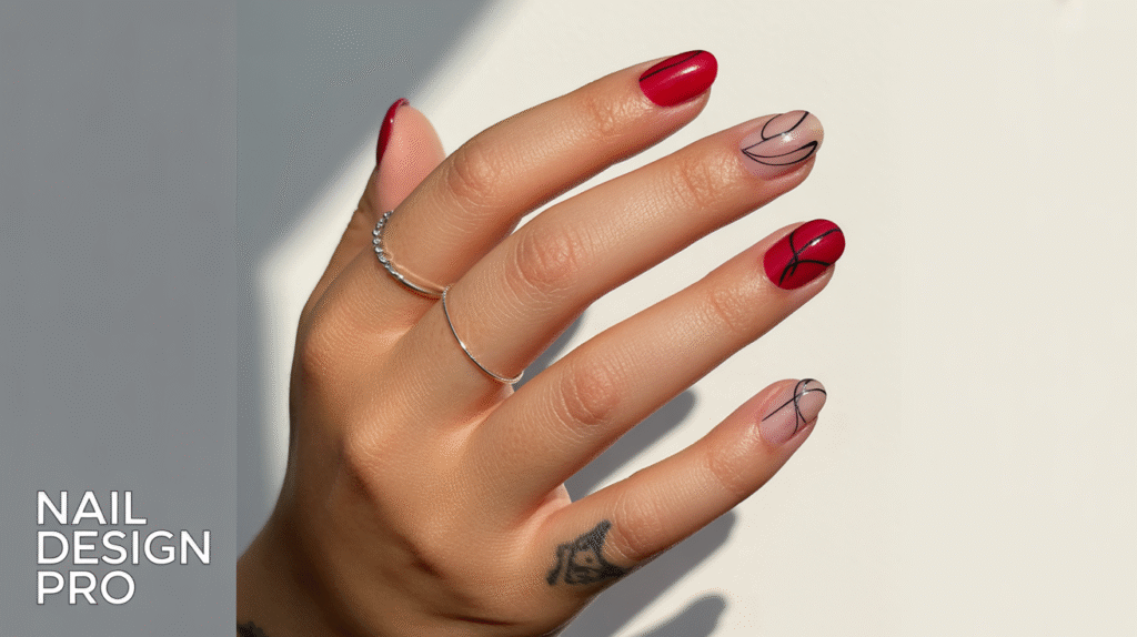 8: Red Nails with Minimal Black Line Art for a Bold Modern Edge